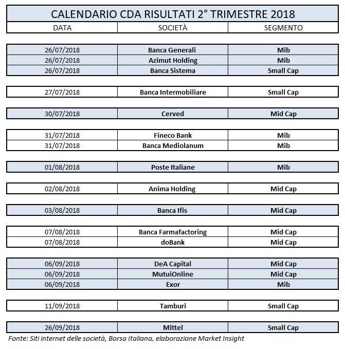 Si riporta di seguito il calendario dei cda per l’approvazione dei conti del secondo trimestre 2018 delle società appartenenti al settore Servizi Finanziari.