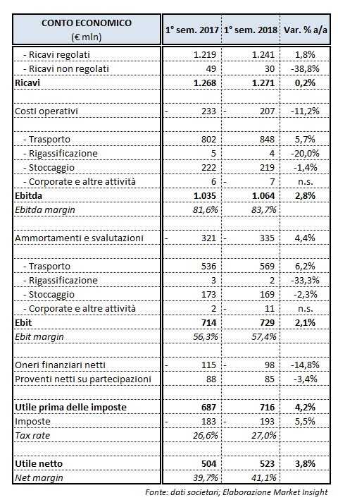 A livello di margini operativi l’Ebitda è cresciuto del 2,8% su base annua a 1,06 miliardi, riflettendo l’incremento della componente trasporto (+5% su base annua) che ha compensato la flessione del margine operativo lordo registrata nel business della rigassificazione e soprattutto in quello dello stoccaggio. Senza dimenticare che la voce Corporate e altre attività e passata a un valore negativo di 7 milioni rispetto a un dato positivo di 6 milioni nel 1° semestre del 2017.