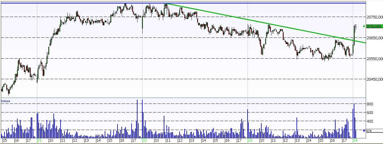 La resistenza più vicina invece si trova a 20.800 punti e, se affrontata al rialzo, porterebbe probabilmente al raggiungimento di 21.100 punti. La seduta odierna, tuttavia, non sembra possa esprimere grossi movimenti con volumi abbastanza scarni.