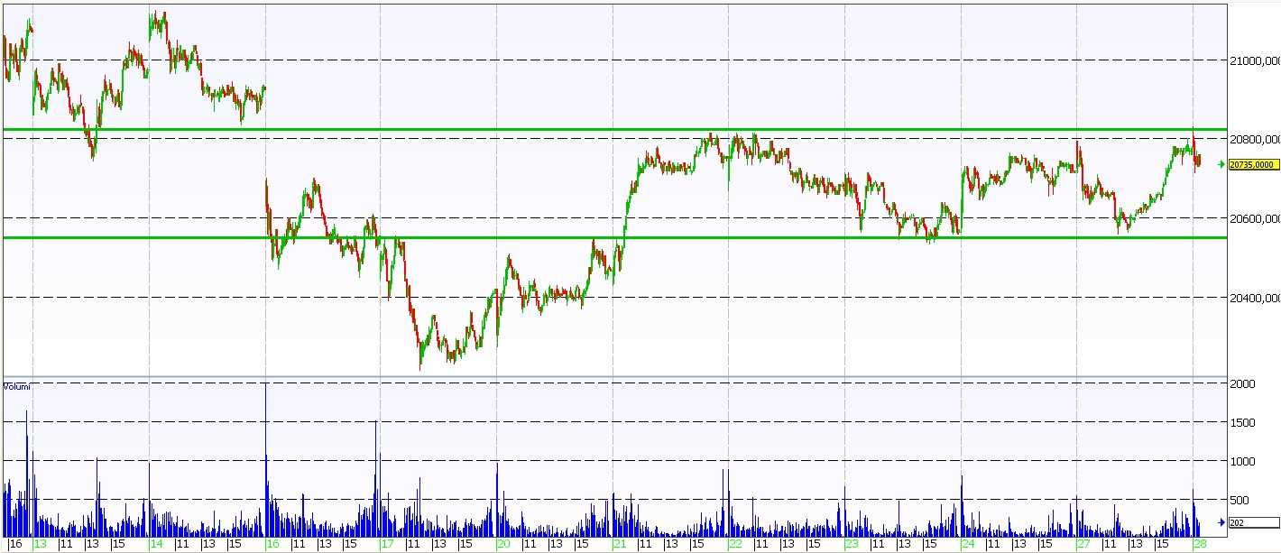 Il derivato italiano non riesce dunque ancora a superare la barriera dei 20.800 punti, resistenza statica che se violata potrebbe portare il mercato verso i 21 mila punti. In caso di vendite, invece, il future ha un supporto statico a 20.550 punti che, se rotto al ribasso, porterà inevitabilmente il mercato verso i minimi di 20.250 punti.