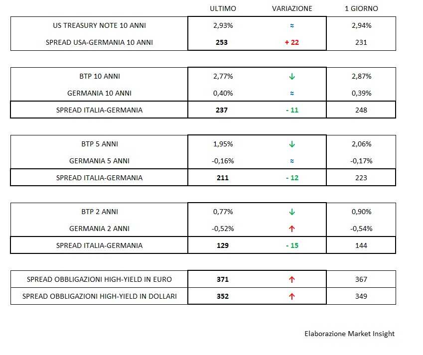 In tale contesto i rendimenti del Btp proseguono il ribasso della mattinata lungo tutta la curva, con variazioni comprese tra i 10 e i 13 centesimi.