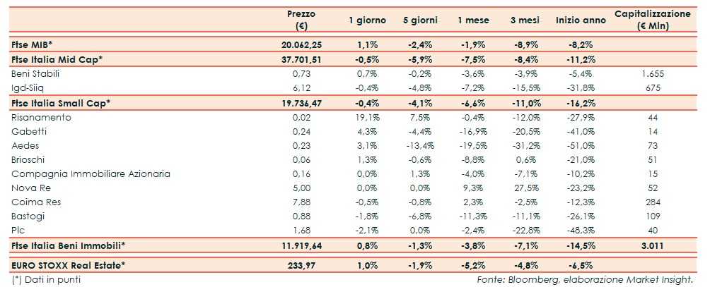 Il Ftse Italia Beni Immobili chiude in frazionale rialzo (+0,8%), sottoperformando il Ftse Mib (+1,1%). In scia l’Euro Stoxx Real Estate (+1%).
