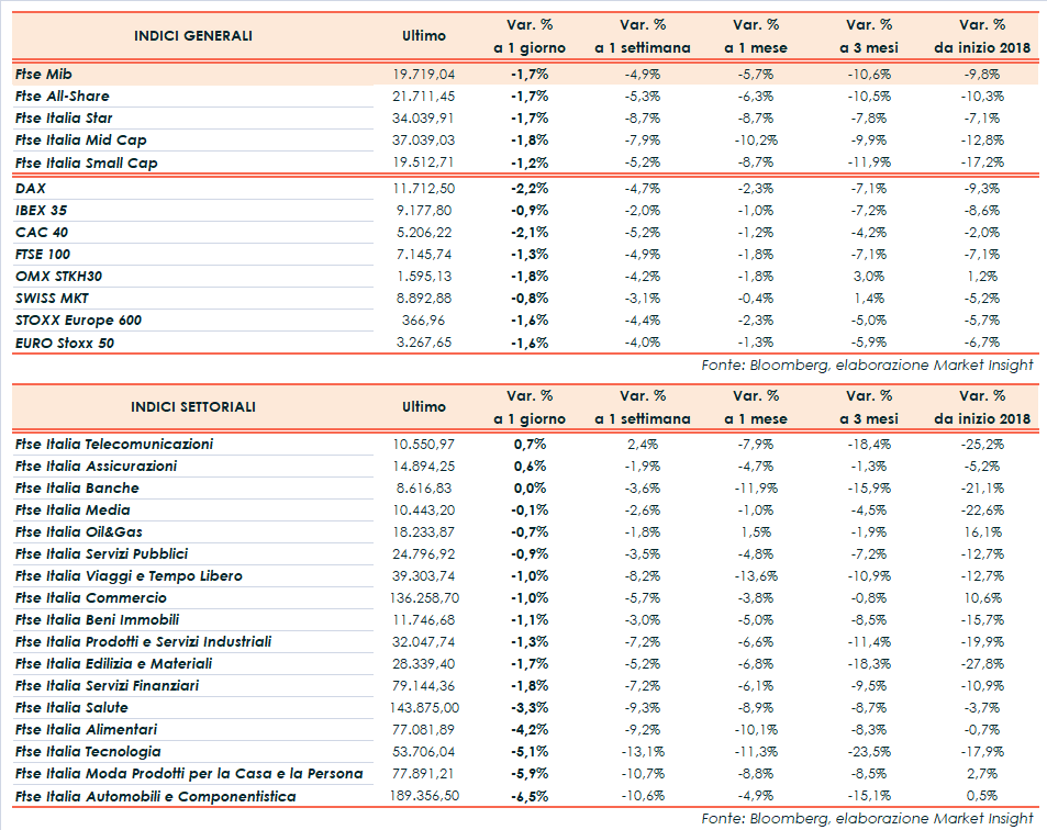 Il sentiment sul mercato azionario resta negativo, condizionato dai diversi fattori di incertezza che scoraggiano gli acquisti, dai dubbi sulla crescita globale per i prossimi anni alla normalizzazione delle politiche monetarie ultra-espansive da parte delle banche centrali, passando per le tensioni commerciali tra Stati Uniti e Cina, la stabilità finanziaria dell’Italia e dell’UE fino alla Brexit.