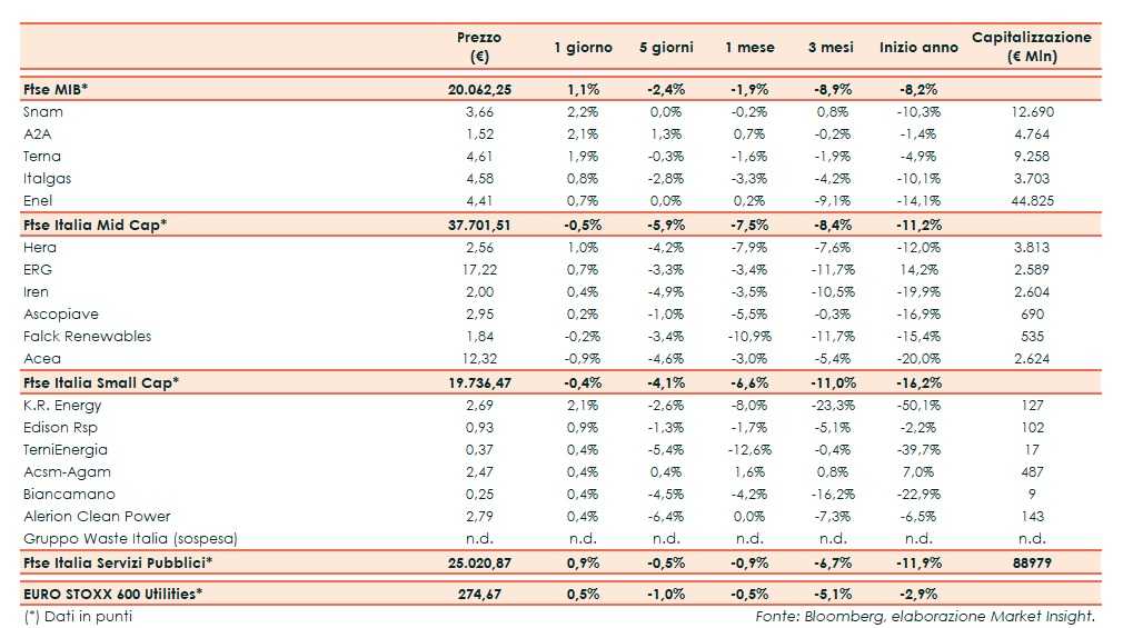 Ieri il Ftse Italia Servizi Pubblici ha chiuso con un +0,9%, facendo meglio del corrispondente indice europeo (+0,5%) e poco al di sotto del Ftse Mib (+1,1%).