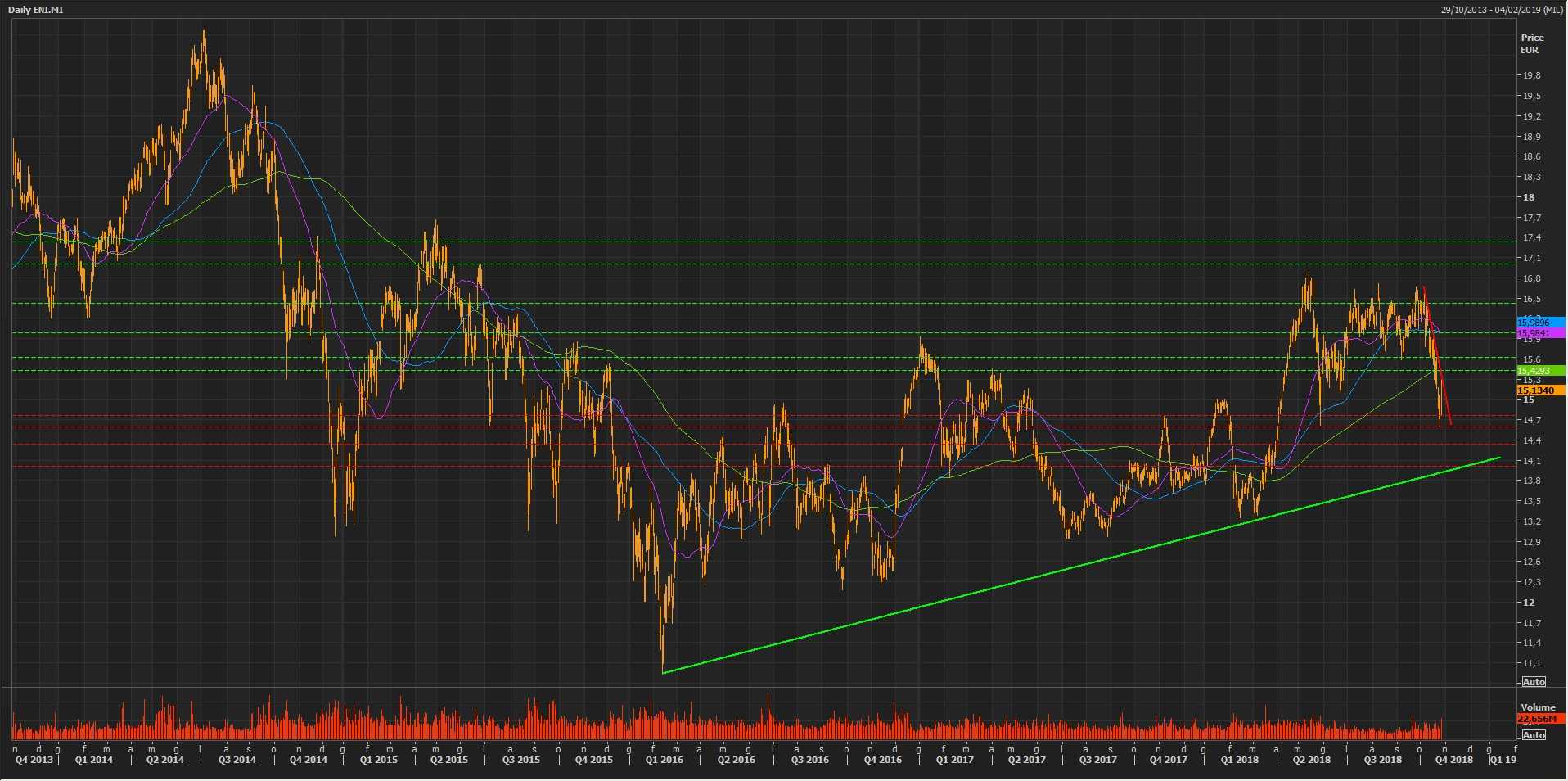Sulla tenuta del supporto statico a 14,60 euro registrata lo scorso giovedì, le quotazioni dei titoli del colosso petrolifero italiano hanno effettuato un rimbalzo nella seduta successiva. Un movimento che è stato sostenuto da una buona trimestrale, ma che si è andato a scontrare con la trend line ribassista di breve periodo, attualmente passante per 15,364 euro.