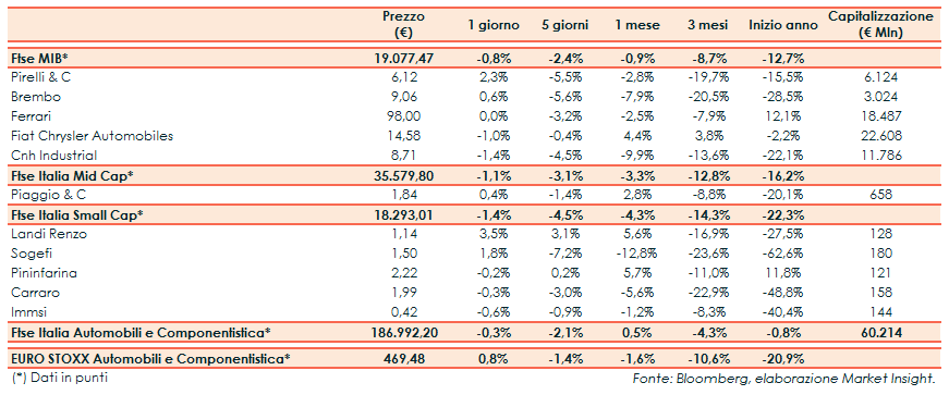 Tra le big del comparto spicca Pirelli (+2,3%) che a mercati chiusi ha diffuso i risultati trimestrali. Timida rimonta per Brembo (+0,6%), mentre ha chiuso invariata Ferrari. In calo Fca (-1%) e Cnh (-1,4%).