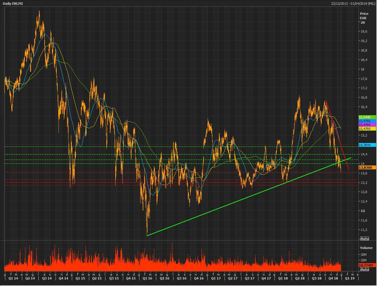 Il movimento discendente avviato lo scorso 5 ottobre a partire dal massimo relativo intraday a 16,668 euro ha spinto le quotazioni dei titoli del colosso petrolifero italiano al di sotto della trend line rialzista di lungo periodo, passante per 14,06 euro, scivolando nella seduta odierna fino al minimo relativo intraday a quota 13,644 euro. Un movimento che è stato alimentato dal crollo delle quotazioni del petrolio che dal top del 3 ottobre a 76,90 dollari al barile ha perso quasi il 40 per cento.