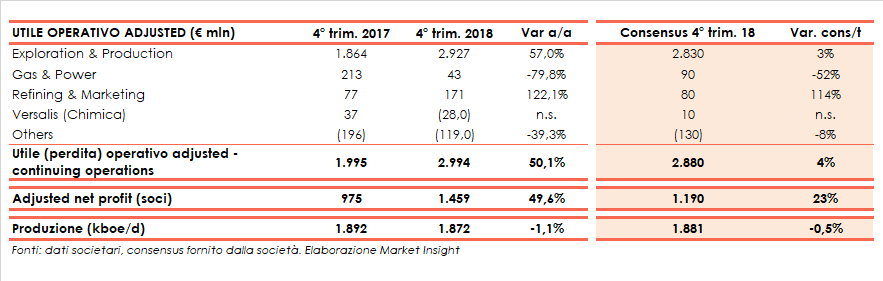 La divisione Gas & Power ha riportato un Ebit adjusted di 43 milioni, in calo del 79,8% e inferiore alle attese (-52% vs consensus), mentre la Versalis ha rilevato una perdita di 28 milioni contro l’utile di 37 milioni del 4Q 17 e quello di 10 milioni atteso dagli analisti.
