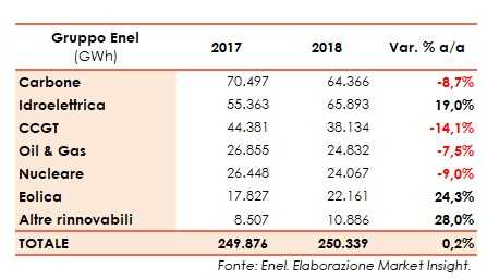 Entrando nel dettaglio, nel 2018 la produzione netta di energia elettrica del gruppo Enel è stata pari a 250.339 GWh, sostanzialmente stabile (+0,2%) rispetto al 2017. Una dinamica che media il progresso dell’output idroelettrico (+19% su base annua), dell’eolico (+24,3%) e delle altre rinnovabili (+28%) e le contrazioni registrate dalla produzione delle centrali a carbone (-8,7%), di quelle CCGT (-14,1%), di quelle Oil & Gas (-7,5%) e di quelle nucleari (-9%).
