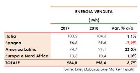Andamento positivo invece per le vendite di energia elettrica realizzate dal gruppo guidato da Francesco Starace nel 2018, con un +3,7% su base annua a 295,4 Twh. Un livello sostenuto soprattutto dall’America Latina (+22%), seguita dall’Italia (+1,1%) e dal resto Europa e Nord Africa (+1%), più che compensando la contrazione in Spagna (-7,2% annua).