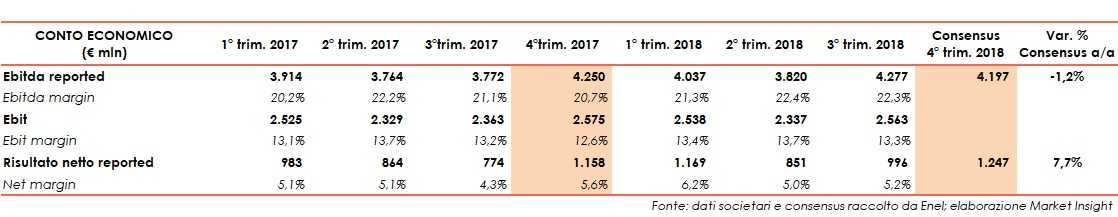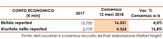 Per quanto riguarda l’intero esercizio 2018, secondo le stime degli analisti raccolte da Enel, l’Ebitda reported dovrebbe attestarsi a 16,3 miliardi, in crescita del 4% rispetto al 2017. Un andamento che si dovrebbe amplificare a livello di utile netto reported, atteso in aumento a doppia cifra del 12,8% a 4,3 miliardi.