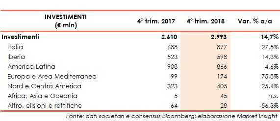 Gli investimenti nel periodo in esame ammontano a quasi 3 miliardi, in crescita del 14,7 per cento. In base alla suddivisione per area geografica, in particolare sono state destinate maggiori risorse in italia (+27,5% a 877 milioni) e in Spagna (+14,3% a 598 milioni). In calo invece gli investimenti in Sud America (-4,6% a 866 milioni).