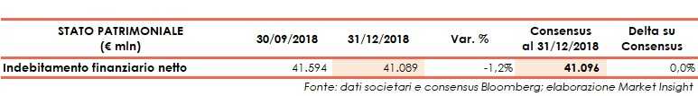 Sul fronte patrimoniale, l’indebitamento finanziario netto al 31 dicembre 2018 si esprime in 41,1 miliardi, in calo dell’1,2% rispetto al dato di fine settembre 2018 e sostanzialmente in linea con il consensus.