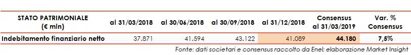 Sul fronte patrimoniale, l’indebitamento finanziario netto al 31 marzo 2019 è previsto pari a 44,1 miliardi, in aumento del 7,5% rispetto al 31 dicembre 2018, prevalentemente per effetto dell’applicazione del nuovo principio contabile IFRS 16, del pagamento dell’acconto sul dividendo e delle operazioni straordinarie effettuate nel periodo.