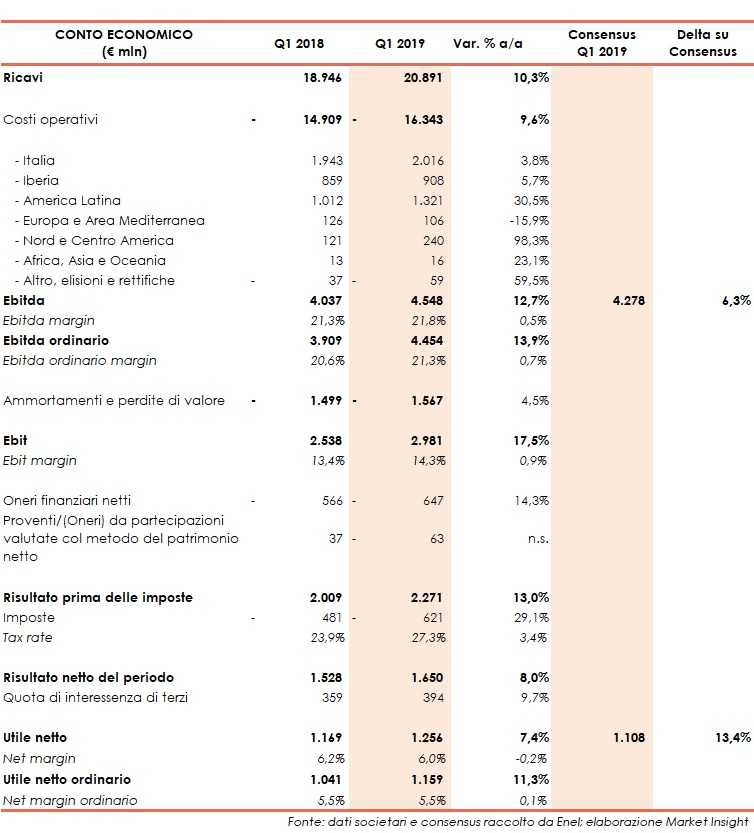Nel 1° trimestre 2019 il gruppo Enel ha registrato ricavi in crescita su base annua del 10,3% a 20,9 miliardi.