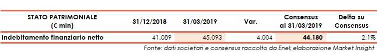 Sul fronte patrimoniale, l’indebitamento finanziario netto al 31 marzo 2019 è aumentato di 4 miliardi a 45,1 miliardi, importo superiore anche alle stime degli analisti (+2,15% vs 44,2 miliardi).