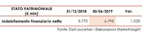 L’indebitamento finanziario netto al 30 giugno 2019 ammonta a 6.795 milioni (vs consensus di 6.858 milioni), in aumento di 1.025 milioni rispetto a fine dicembre 2018. La variazione è riconducibile all’effetto dello standard contabile IFRS 16 (+186 milioni), agli investimenti connessi alla costruzione di nuova capacità rinnovabile, a cui si aggiunge il pagamento di dividendi (acconto) per 741 milioni.