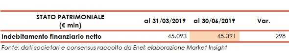 L’indebitamento finanziario netto al 30 giugno 2019 cifra in 45,4 miliardi, sostanzialmente in linea con il valore di fine marzo 2019 (+298 milioni).