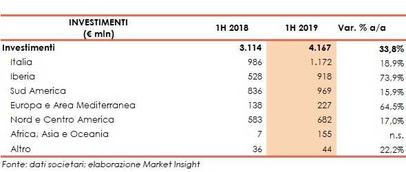 Gli investimenti sono balzati del 33,8% a 4,2 miliardi e hanno interessato principalmente il settore delle rinnovabili, in particolare in Iberia (408 milioni), Messico (168 milioni), Brasile (116 milioni) e Sudafrica (62 milioni). Sono state inoltre destinate risorse alle reti di distribuzione in Italia (132 milioni) per attività legate alla qualità del servizio e alla sostituzione dei contatori elettronici.