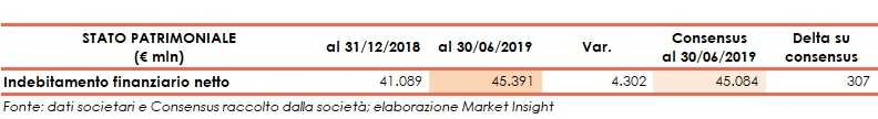 L’indebitamento finanziario netto al 30 giugno 2019 cifra in 45,4 miliardi, in aumento di 4,3 miliardi rispetto al valore di fine dicembre 2018, e sostanzialmente in linea con le stime degli analisti (45,1 miliardi).