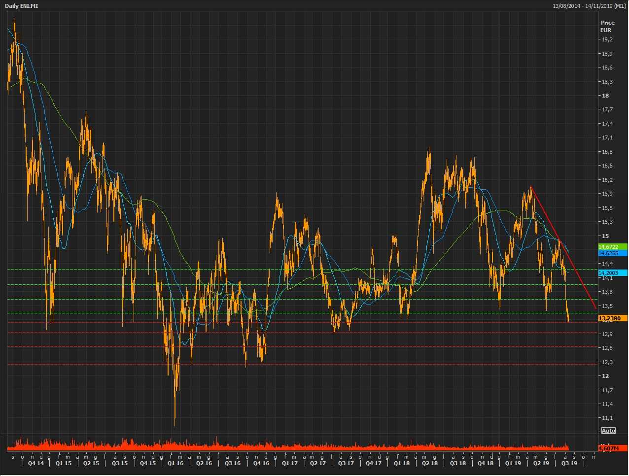 Il movimento ribassista avviato poco prima di metà luglio dalle quotazioni dei titoli del colosso petrolifero italiano è giunto a ridosso di 13,15 euro, cioè poco sotto l’importante doppio minimo realizzato tra febbraio e marzo dello scorso anno.