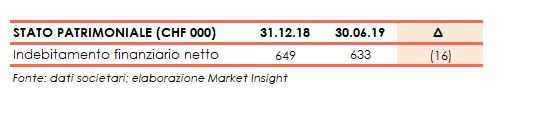 A fine giugno 2019, l’indebitamento finanziario netto è sceso di CHF 16mila a CHF 633mila rispetto ai CHF 649mila al 31 dicembre 2018.