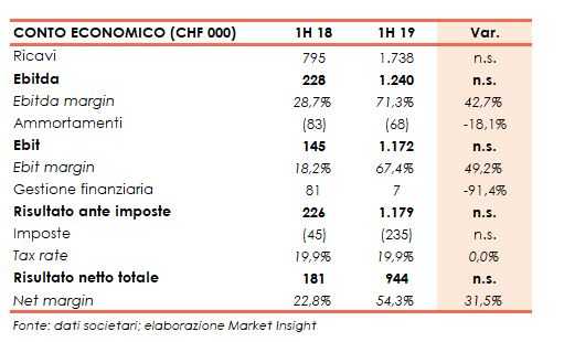L’Ebitda è balzato a CHF 1,2 milioni da 0,2 milioni nel 1H 2018, con una marginalità passata al 71,3% da 28,7% dell’anno precedente.