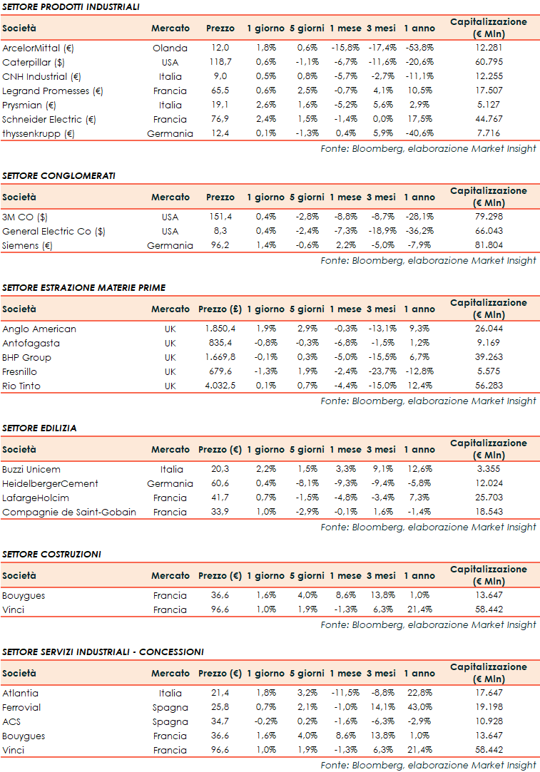 Si riporta l’andamento odierno dei principali titoli internazionali del settore industriale: