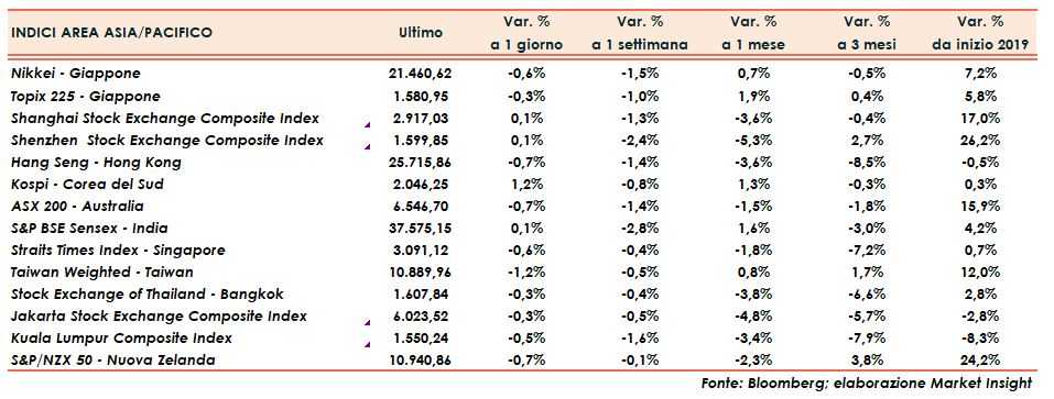 Seduta in rosso invece per il Giappone con il Nikkei a -0,6% e il Topix a -0,3%.