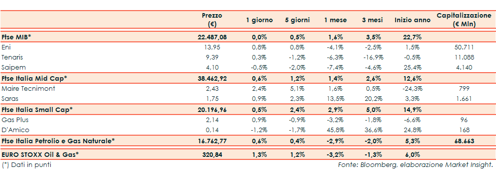 Giornata positiva per il Ftse Italia Petrolio e Gas Naturale che ha chiuso ieri a +0,6% rispetto al +1,3% del corrispondente indice europeo.