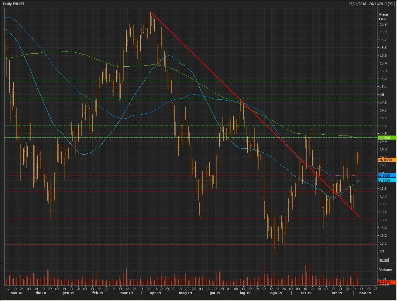 In un contesto di prezzi del petrolio in ascesa, un nuovo segnale di forza per i corsi delle azioni Eni potrebbe arrivare dal superamento, confermato in chiusura di seduta, dell’importante resistenza statica e dinamica (media mobile a 200 sedute) posizionata a 14,451 euro al di sopra della quale il successivo livello da monitorare è individuabile a 14,60 euro.