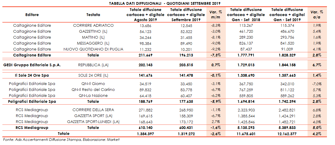 Da inizio anno, i quotidiani presentano complessivamente una crescita del 4,2% a 12.162.377 copie diffuse rispetto ai primi nove mesi del 2018 (11.675.601 copie).