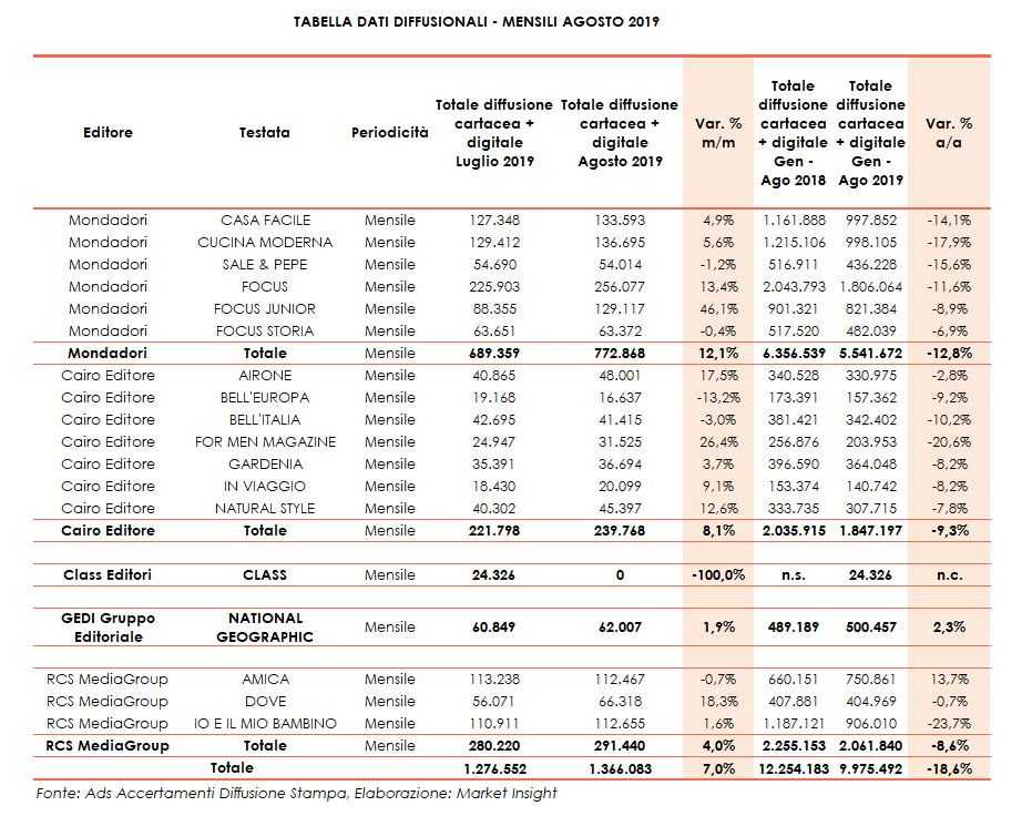 Ad agosto la diffusione dei mensili ha riportato un aumento del 7% a circa 1,4 milioni di copie cartacee e digitali diffuse.