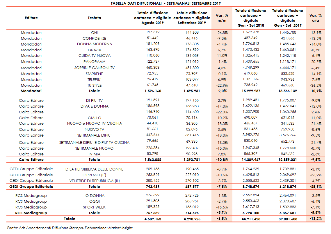 Per quanto riguarda i settimanali, nel solo mese di settembre la diffusione ha registrato una diminuzione pari al 6,5% a 4.290.925 copie. Un andamento negativo sui cui pesano in misura rilevante tutti i settimanali di Cairo Editore (-10,8% a 1.392.721 copie), ad eccezione di “Tv Mia” (+7,8%), “Di Più Tv” (+2,7%) e “Nuovo Tv” (+0,5%).