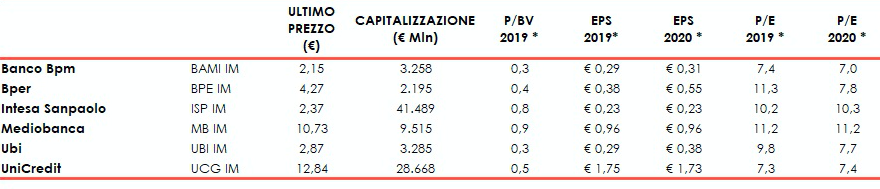 I multipli delle principali banche italiane secondo Bloomberg a oggi.