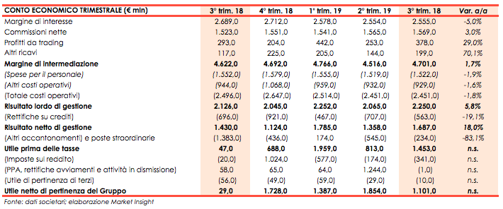 Il margine di intermediazione si è attestato a 4.701,0 milioni in lieve crescita (+1,7%) rispetto al terzo trimestre 2018. Il calo del margine di interesse, sceso a 2.555,0 milioni (-5% a/a), è stato compensato dall’aumento delle altre componenti di ricavo.