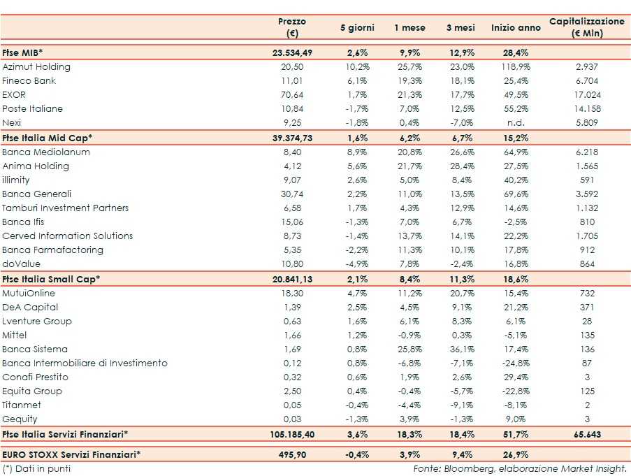 Il Ftse Italia Servizi Finanziari termina la settimana con un balzo del 3,6% e in direzione opposta rispetto all’analogo europeo (-0,4%), beneficiando degli acquisti sul comparto bancario (+4,6%) e facendo meglio del Ftse Mib (+2,6%).
