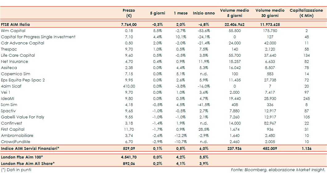 Il Ftse Aim Servizi Finanziari ha terminato a +0,1%.