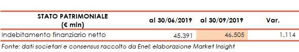 L’indebitamento finanziario netto cifra in 46,5 miliardi, sostanzialmente stabile rispetto a 45,4 miliardi di fine giugno 2019.