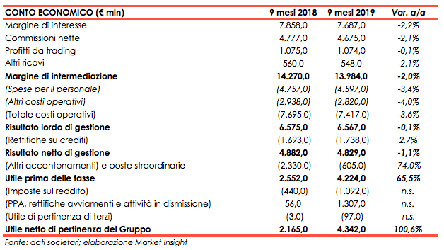 Il miglioramento della gestione non operativa, con gli altri accantonamenti e poste straordinarie che scendono dai 2.330,0 milioni dei primi 9 mesi 2019 (che includevano la svalutazione su Yapi e gli accantonamenti sulle sanzioni Usa) a 605,0 milioni, mentre la voce PPa, rettifiche avviamenti e attività in dismissione sale da 56,0 milioni a 1.307,0 milioni, grazie alla cessione di Fineco, non sono intaccate sensibilmente dall’incremento delle imposte dai 440,0 milioni dei primi nove mesi 2018 ai 1.092,0 milioni registrati nel periodo gennaio-settembre 2019.