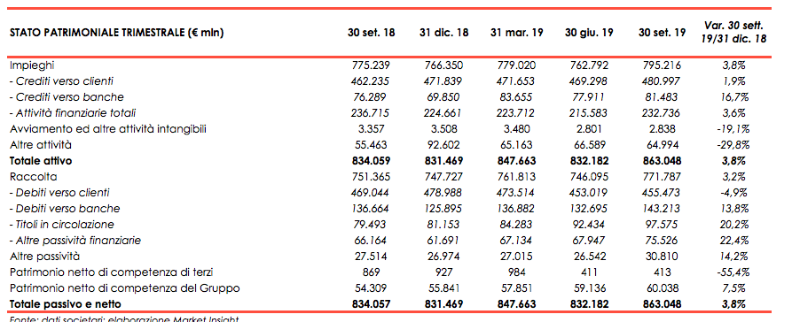 Le rettifiche su crediti sono aumentate nei nove mesi in esame del 2,7% a 1.738,0 milioni. L’obiettivo per il costo del rischio è confermato a 55 punti base per il 2019, inclusi 4 punti base di impatto dei modelli.