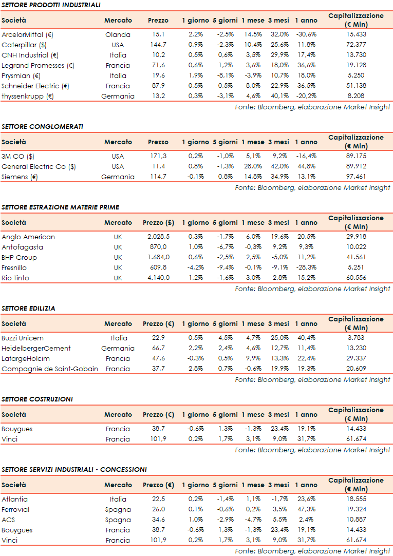 Si riporta l’andamento odierno dei principali titoli internazionali del settore industriale: