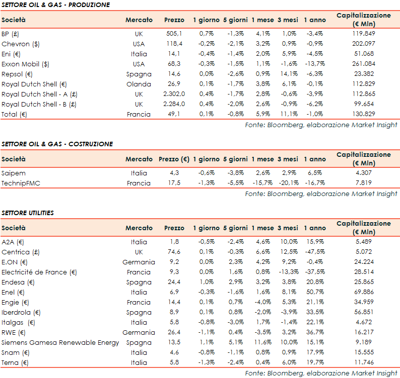 Si riporta l’andamento odierno dei principali titoli internazionali del settore energetico e delle utilities: