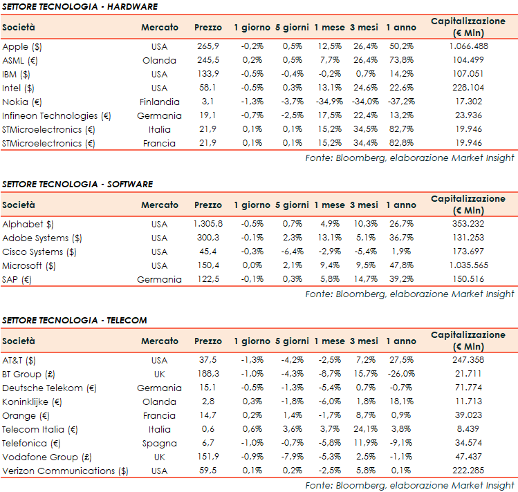 Si riporta l’andamento odierno dei principali titoli internazionali del settore tecnologico e del settore delle telecomunicazioni.