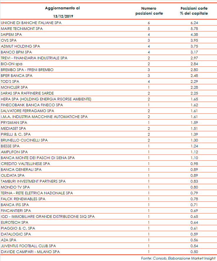 Al secondo posto Maire Tecnimont, con 5 posizioni nette ribassiste per una quota pari al 5,78% del capitale (5 posizioni pari al 5,99% del capitale al 6 dicembre).