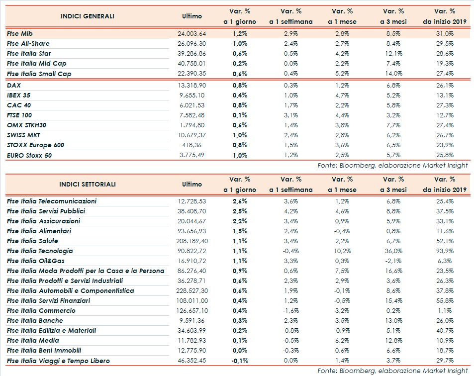 A piazza Affari il Ftse Mib termina in progresso dell’1,2% a 24.003 punti, sui livelli di maggio 2018, seguito da Dax di Francoforte (+0,8%), Cac 40 di Parigi (+0,8%), Ibex 35 di Madrid (+0,4%) e Ftse 100 di Londra (+0,1%).