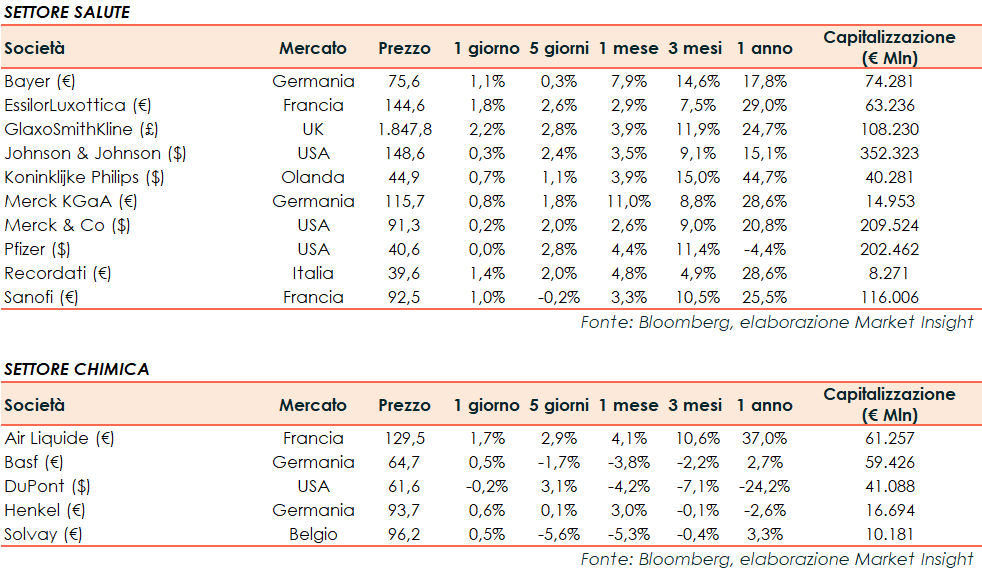Si riporta l’andamento odierno dei principali titoli internazionali dei settori della Sanità e della Chimica: