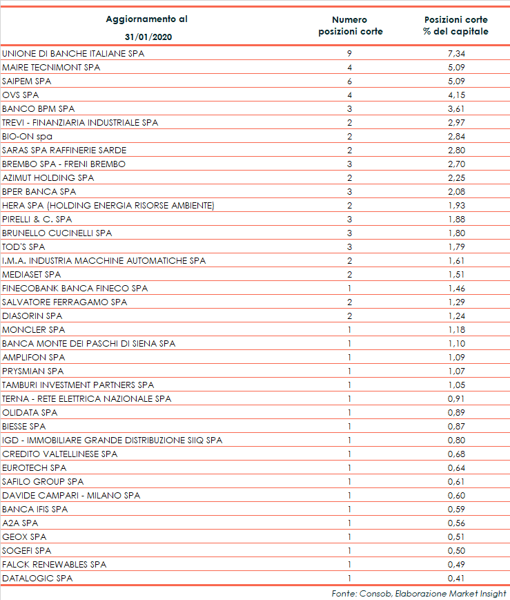 Nella tabella qui di seguito proponiamo l’aggiornamento al 31 gennaio delle posizioni short comunicate giornalmente alla Consob dagli operatori finanziari.