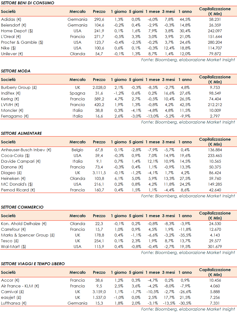 Si riporta l’andamento odierno dei principali titoli internazionali del settore relativo ai beni di consumo: