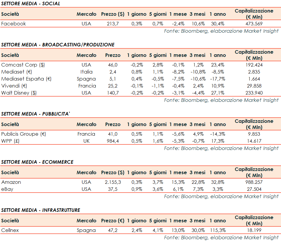 Si riporta l’andamento odierno dei principali titoli internazionali del settore dei media: